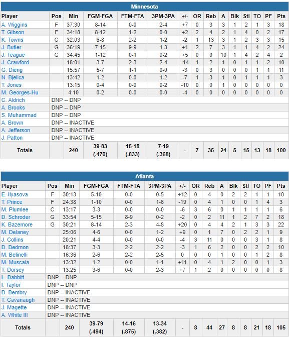 Taj Gibson avait bien réduit l’écart à 101-100 suite à un shoot raté de Dennis Schröder (18 points dont 4 lancers-francs dans les dernières 11.3 secondes) mais après un temps-mort à 14.5 secondes du buzzer, Teague (1/12 aux tirs pour 2 points et 10 passes) a perdu le ballon sur une violation des 5 secondes. Jimmy Butler termine à 24 points à 7/15, Andrew Wiggins 18 points, Karl-Anthony Towns 15 points et 13 rebonds.