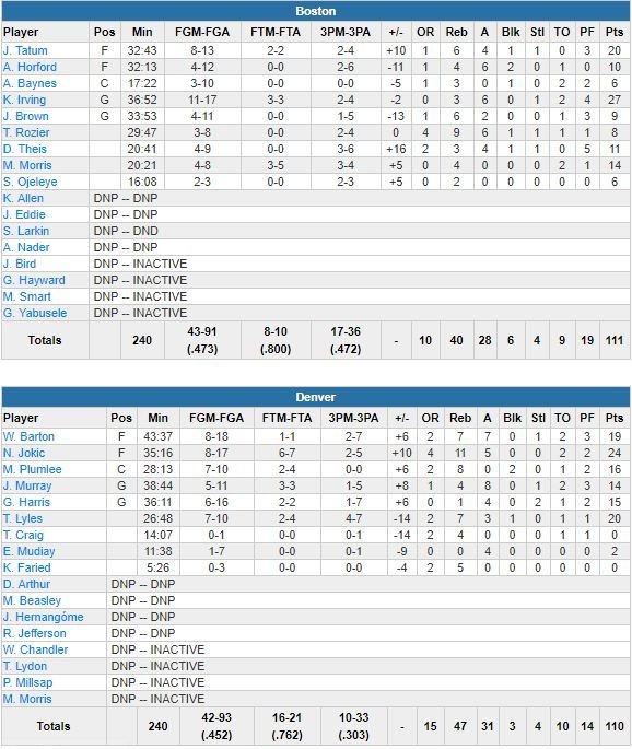 Kyrie Irving a marqué 10 de ses 27 points (11/17, 3 rebonds et 6 passes) dans le dernier quart, Jaylen Brown (9 points à 4/11) a rentré un 3-points pour repasser devant à 34 secondes de la fin (après que les Nuggets aient égalisé alors que Boston avait repris 6 points d’avance à 2 minutes de la fin) et Trey Lyles a rentré trop tard une claquette sur une tentative à 3-points manquée de Will Barton (19 points à 8/18, 7 rebonds et 7 passes).