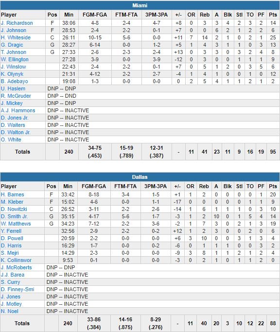 Son équipe n’a plus jamais couru après le score suite à une interception de Goran Dragic pour le 3-points de Tyler Johnson (afin de prendre 3 points d’avance, 38-35) à 4 minutes et demi la fin de la 1ère mi-temps. Dallas, mené par les 20 points d’Harrison Barnes et les 19 unités de Wesley Matthews, a été limité à 15 points seulement dans le 3ème quart, et s’incline pour la 4ème fois d’affilée et pour un 7ème match en 8 rencontres.