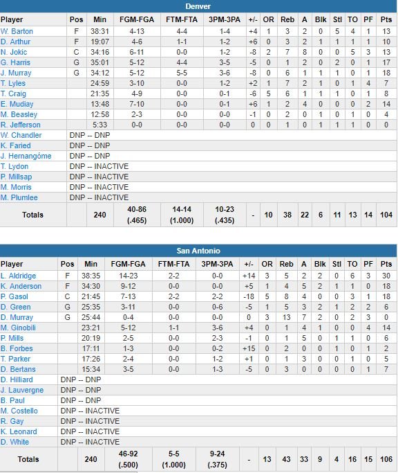 Pour remporter ce 11ème match consécutif à domicile face à Denver, San Antonio a dû passer par 18 changements de leader au cours du match. Un 3-points de Murray à 31.6 secondes a ramené les visiteurs à 106-104. Danny Green a manqué sa chance de loin dans la foulée mais Will Barton a aussi échoué derrière l’arc à la dernière second.