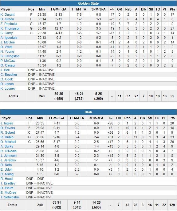 Steve Kerr a capitulé à 6 minutes de la fin en retirant ses titulaires du match. Klay Thompson a terminé meilleur marqueur des visiteurs avec 27 points à 12/17 et 6 rebonds, Kevin Durant et Stephen Curry ont de leur côté combiné pour un 1/12 à 3-points et respectivement 17 et 14 points.