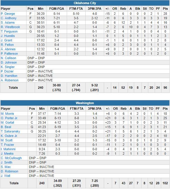 À noter : Bradley Beal a terminé à 21 points et 9 passes, Paul George 28 dont 20 en 1ère mi-temps, 0 tir dans le dernier quart. Washington a shooté à 38.2%, le Thunder 37.5%.