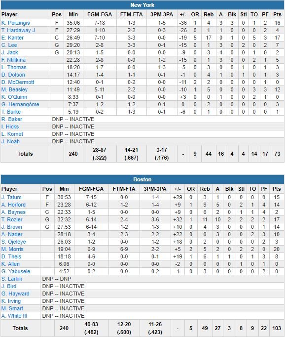Pour sa première titularisation en NBA, Terry Rozier a marqué le coup avec son premier triple-double en carrière dans une victoire écrasante des Celtics sur New York cette nuit, 103-73 : 17 points à 6/14, 11 rebonds et 10 passes. Kyrie Irving out (quadriceps), lui et Marcus Morris (20 points), Jayson Tatum (15) Al Horford (14) et Jaylen Brown (14) ont fait le taf en permettant à leur équipe de remporter leur plus large victoire de la saison.