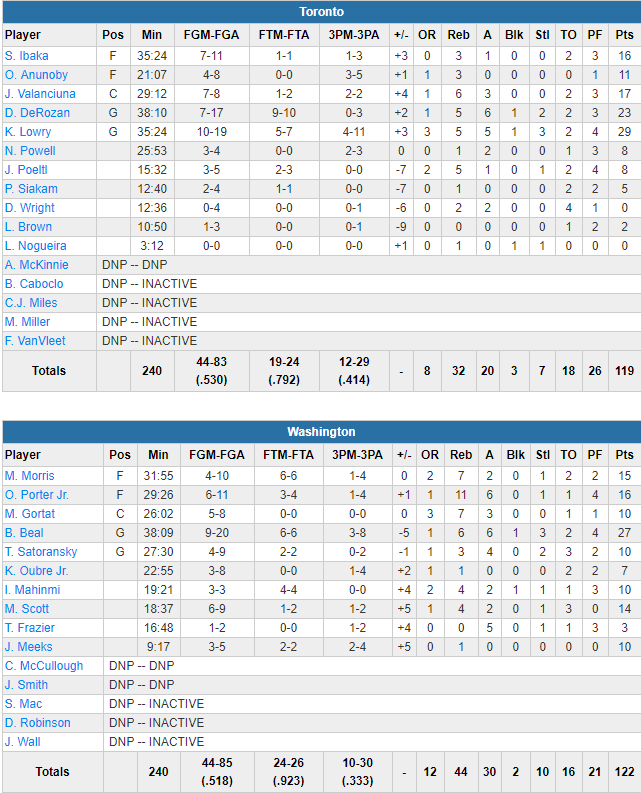 Beal est l’homme du match avec 25 de ses 27 points après la pause pour porter les siens dans une rencontre où Toronto a mené toute la première mi-temps. Il a été bien épaulé par 7 autres joueurs à au moins 10 points dont 16 points à 6/11, 11 rebonds et 6 passes d‘Otto Porter Jr., 15 points de Markieff Morris et 14 points de Mike Scott. Washington shoote à un excellent 51.8% mais Toronto fait encore mieux avec 53% dont un 12/29 à 3-pts. Washington compense avec un joli 24/26 sur la ligne des lancers et 12 rebonds offensifs (44-32 au rebond). En face Toronto a été mené par un quatuor Kyle Lowry (29 points à 10/19, 5 rebonds et 5 passes), DeMar DeRozan (23 points à 7/17, 5 rebonds et 6 passes), Jonas Valanciunas (17 points à 7/8 et 6 rebonds) et Serge Ibaka (16 points à 7/11). Mais le banc n’a pas été aussi performant que celui de Washington et les locaux ont mieux géré le money time.