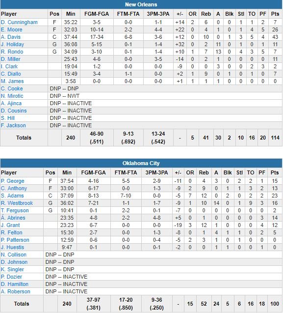 Les Pelicans, 51% de réussite aux tirs, restaient sur 2 défaites depuis la rupture du tendon d’Achille de DeMarcus Cousins. Le Thunder s’incline de son côté pour la 3ème fois d’affilée avec un pourcentage catastrophique : 38%. Russell Westbrook signe son 16ème triple-double de la saison (16 points à 7/21, 10 rebonds et 14 passes) mais shoote à 7/21, Paul George termine à 15 points à 4/16, 4 rebonds et 3 passes, Carmelo Anthony 13 points à 6/17.