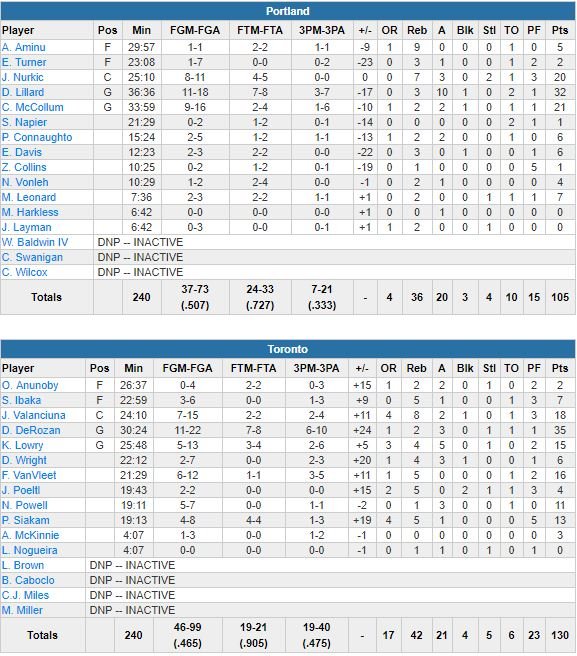 C.J. McCollum et Jusuf Nurkic ont épaulé Lillard avec respectivement 21 et 20 points mais aucun autre joueur de Portland n’a inscrit plus de 5 points sur les 3 premiers quarts. DeRozan et Valanciunas ont planté 16 et 11 points durant un premier quart remporté 37-18 par les locaux. Lillard, auteur des 9 premiers points de son équipe, était le seul joueur adverse en réussite dans la période avec 12 points à 4/5, alors que le reste de l’équipe a combiné pour un 2/13.