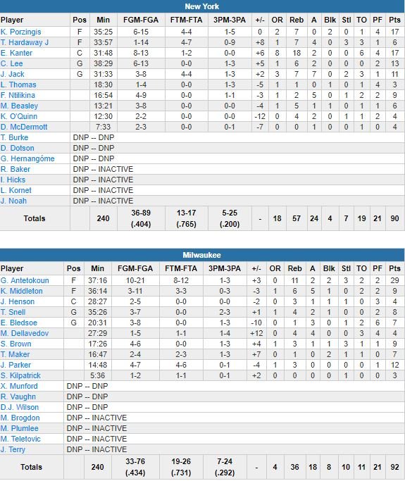 À égalité 55 partout à la mi-temps, les deux équipes l’étaient encore à l’entame du dernier quart, 74-74, puis toujours à 2 minutes de la fin, 90-90. Suite à deux lancers manqués de Tim Hardaway Jr., Antetokounmpo a manqué un step-back à 41.8 secondes. Kanter a poursuivi la mauvaise série en ratant un layup avant qu’Antetokounmpo ne trouve le chemin du cercle pour son tir décisif. Après un temps-mort de Jeff Hornacek, Hardaway Jr., alors à 1/14 aux tirs, hérite du ballon de la gagne, c’est manqué.