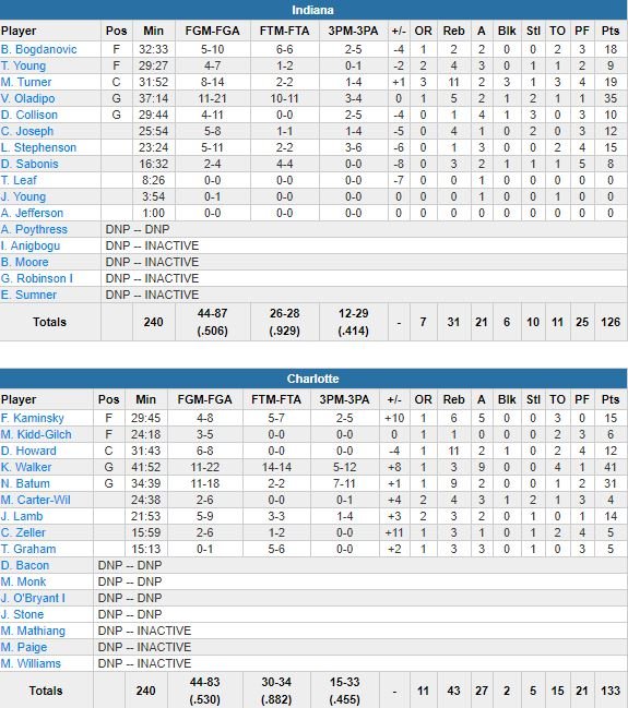 À noter : Charlotte a établi un record de points dans un quart-temps avec ses 49 unités dans le 1er quart (record en NBA cette saison également). Myles Turner signe 19 points et 11 rebonds.