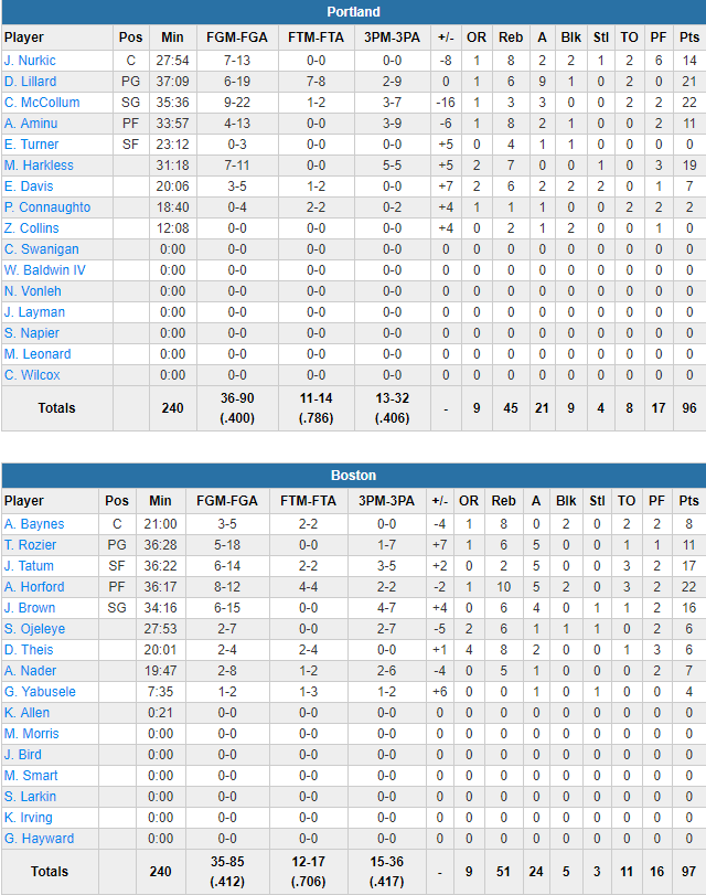 Boston a démarré à merveille la seconde mi-temps avec un 22-7 sous l’impulsion du trio Horford, Baynes et Horford, 61-60. McCollum et Lillard ont permis à Portland, bien moins en réussite, de conserver les commandes pour entamer le dernier acte avec l’avantage 73-69. Boston a fini par revenir à hauteur sur un 6-0 conclu par Tatum, 75-75. Portland a répondu en marquant les 6 points suivants mais Boston s’est accroché et est une nouvelle fois revenu et même passé devant grâce à 3 tirs à 3-points signés Semi Ojeleye, Tatum et Horford pour un 10-0. Boston s’est retrouvé aux commandes 90-85 avec 2 minutes à jouer. Les deux équipes ont alors échangé les 3-pts avec McCollum, puis Brown en fin de possession et Lillard à 1’05 du buzzer pour mettre Portland à 2 points, 93-91. Lillard a égalisé sur un floater avec 35 secondes à jouer mais sur un shoot très compliqué, Rozier a remis Boston en tête avec 14 secondes au chronomètre. Suffisant pour que Lillard aille planter un layup avec la faute, 96-95. Portland a fait faute puisqu’il y en avait encore une à donner et avec 4 secondes à jouer, Boston a servi Al Horford qui a planté un fadeaway à mi-distance pour la gagne.