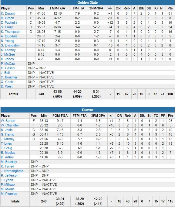 Jamal Murray, sorti car touché à la jambe droite suite à un contact avec Draymond Green (8 points à 4/12, 6 rebonds et 8 passes) après une minute de jeu mais revenu en jeu, signe 12 de ses 15 points en seconde mi-temps. Golden State, mené par les 31 points (12/16, 6 rebonds, 7 passes et 2 contres) de Kevin Durant et les 24 points (8/16, 6 rebonds, 4 passes) de Stephen Curry, perd ce match après avoir laissé 12 points d’avance en seconde mi-temps filer.