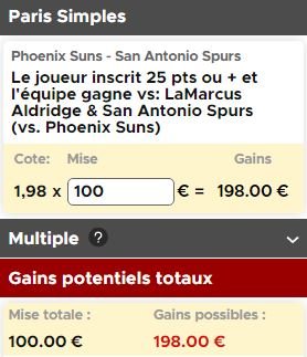 Pour un pari un peu moins risqué, on vous propose de miser sur un match à au moins 25 points de LaMarcus Aldridge dans une victoire des Spurs à Phoenix. L’intérieur tourne à 22.4 points par match cette saison et a signé au moins 30 points dans 2 de ses 3 derniers matchs. La cote de 1.98 (elle peut varier) est intéressante et on va miser dessus, ce qui nous donne un gain potentiel de 98€.