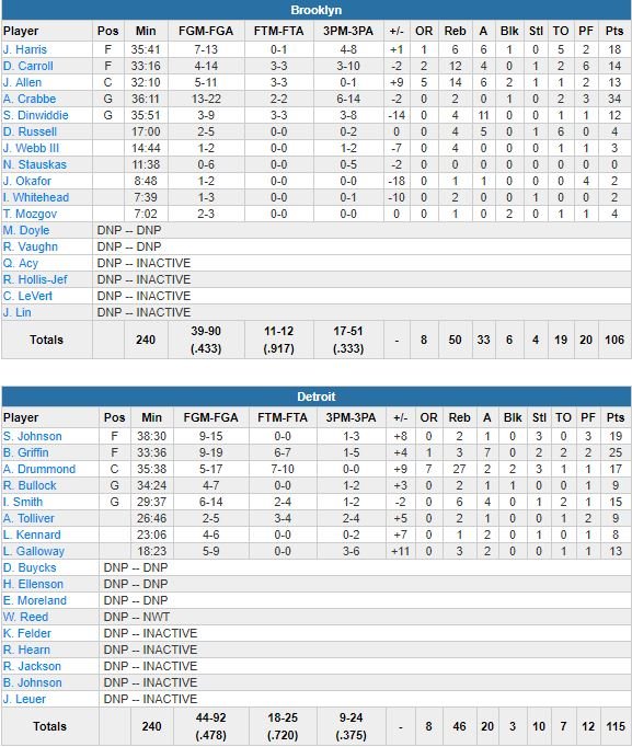Allen Crabbe a tout tenté en inscrivant 19 de ses 34 points dans le dernier quart mais les Nets s’inclinent pour la 4ème fois d’affilée et pour la 8ème fois en 9 matchs. Après un 3-points de Crabbe pour revenir à 91-88, Griffin a répondu en claquant 9 des 11 points suivants. Dominés 50-46 au rebond, les Pistons, également aidés par Stanley Johnson (19 points à 9/15) et Ish Smith (15 points à 6/14, 6 rebonds et 4 passes) ont largement dominé sur ballons perdus (7 à 20) et points du banc (30-15).