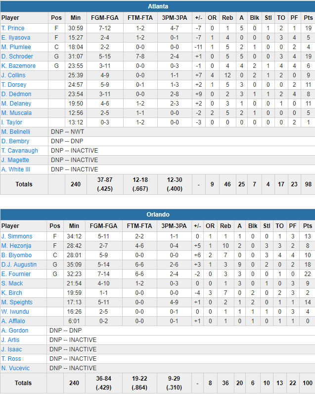 Les Floridiens peuvent remercier Evan Fournier, homme du match avec 22 points à 7/14 dont 8 de suite en fin de rencontre. DJ Augustin, titularisé après le transfert d’Elfrid Payton, signe 18 points à 8/14 et 9 passes alors que Jonathon Simmons ajoute 13 points et Mo Speights 14. En face les Hawks ont pu compter sur 19 points de Dennis Schröder et Taurean Prince mais l’équipe a craqué dans le money time.