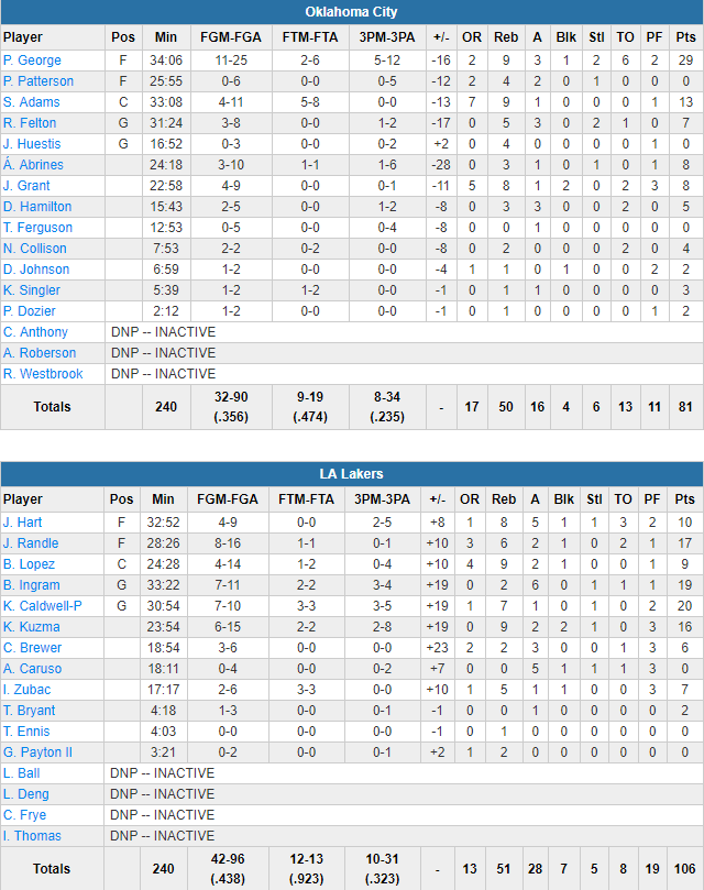 Malgré les absents pour cause de transfert, les Lakers ont été menés par un quatuor Kentavious Caldwell-Pope (20 points à 7/10 dont 3/8 à 3-pts), Brandon Ingram (19 points à 7/11 et 6 passes), Julius Randle (17 points, 6 rebonds) et Kyle Kuzma (16 points et 9 rebonds). S’ils ne shootent qu’à 43.8% ils limitent leurs ballons perdus à 8 en plus de 13 rebonds offensifs alors qu’en face OKC, privé de Russell Westbrook et Carmelo Anthony, blessé à la cheville, shoote à 35.6%. Seul Paul George a surnagé avec 29 points à 11/25 et 9 rebonds. Derrière seul Steven Adams atteint les 10 points avec 13 unités à 4/11 et 9 rebonds.