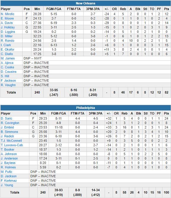 Les Sixers étaient fiers de leur défense après leur victoire face aux Pelicans et ils avaient de quoi. Portés par un duo Joel Embiid (24 points à 11/18, 16 rebonds) – Dario Saric (24 points à 8/11, 5 rebonds et 4 passes) en attaque, l’équipe a limité New Orleans à 82 points (100-82) vendredi soir.