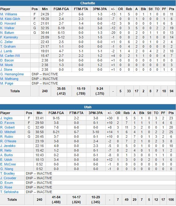 Fraîchement nommé All-Star en remplacement de Kristaps Porzingis, Kemba Walker a été limité à 19 points (8/19, 3 rebonds et 5 passes) alors qu’il restait sur un match à 40 unités à Portland et les Hornets terminent leur road trip à l’Ouest sur 3 défaites consécutives. Le Jazz a bien résisté à une réussite insolente de ses adversaires à 3-points dans le 3ème quart-temps en bouclant la période sur un 9-2, rapidement transformé en 16-5 pour compter 12 points d’avance (91-79) en début de 4ème quart. C’en était trop pour les joueurs de Steve Clifford, tenus à 17 points dans le 4ème quart et dominés 58-30 dans la peinture.