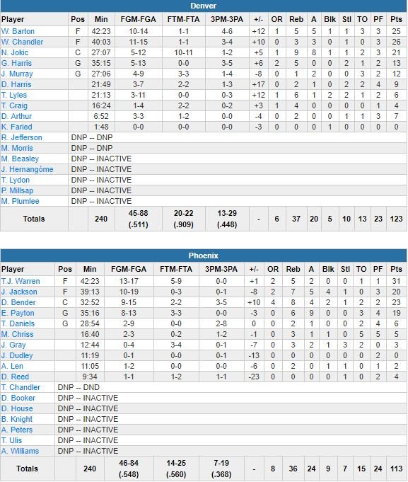 Avec un gros trio Wilson Chandler (26 points) – Will Barton (25 points) – Nikola Jokic (21 points, 9 rebonds, 7 passes), les Nuggets ont fait la différence grâce à une grosse 2ème mi-temps à Phoenix cette nuit. Après avoir passé la barre des 10 points d’avance suite à un 36-15 en milieu de 4ème quart, Denver a ensuite été porté jusqu’à la ligne d’arrivée par deux 3-points de Chandler alors que Phoenix (31 points de T.J. Warren, 23 points de Dragan Bender et 20 points de Josh Jackson) était revenu à 109-103 à 4 minutes et demi de la fin.