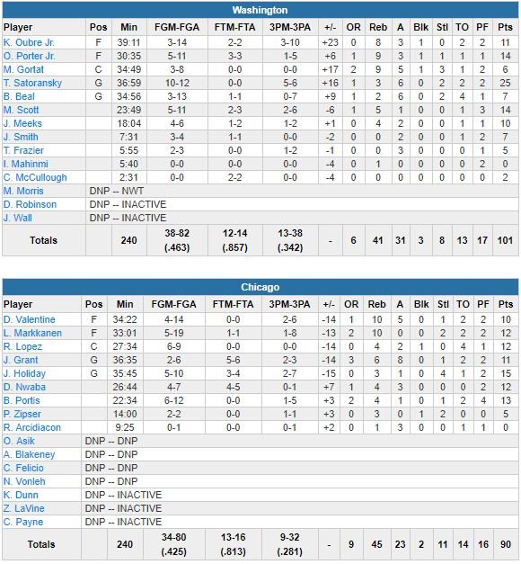 John Wall toujours convalescent après son opération du genou, Tomas Satoransky a battu son record en carrière dans la victoire des Wizards à Chicago cette nuit, avec 25 points à 10/12. Malheureusement pour lui, la soirée s’est terminée prématurément sur une chute à 2 minutes et demi de la fin après une faute. Otto Porter Jr. et Mike Scott ont inscrit 15 points chacun dans cette 6ème victoire en 7 matchs de Washington alors que Bradley Beal a été limité à 3/13.