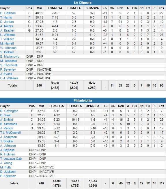 Au final, Philadelphie (32 passes décisives à 20), également aidé par les 17 points à 5/10 à 3-points de J.J. Redick, les 17 points et 8 passes de T.J. McConnell ou encore les 14 points et 10 passes de Ben Simmons, a terminé son match sur un 17-5. À 10/17 à 3-points en première mi-temps, l’équipe était devant 69-55 à la pause avant de ne rentrer qu’une tentative sur 10 dans le 3ème quart. Tout en perdant 5 ballons dans la période, laissant les Clippers revenir à 6 points avant de jouer les 12 dernières minutes, 85-78.