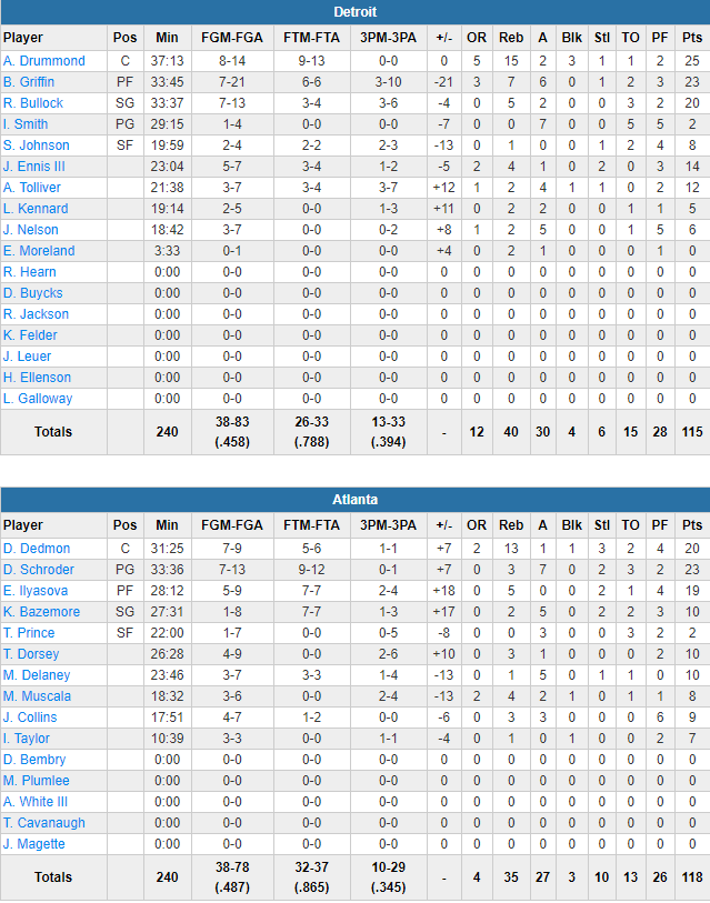 Dewayne Dedmon a été clutch avec un 2+1 et un 3-pts dans les 94 dernières secondes pour permettre aux siens de passer devant et de s’imposer. Les Hawks ont été menés par le pivot, auteur de 20 points et 13 rebonds et par Dennis Schröder (23 points à 7/13 et 7 passes) et Ersan Ilyasova (19 points à 5/9) et un très bon banc, auteur de 44 points. Detroit s’est appuyé sur le trio Andre Drummond (25 points à 8/14, 15 rebonds et 3 contres), Blake Griffin (23 points à 7/21, 7 rebonds et 6 passes) et Reggie Bullock (20 points à 7/13 et 5 rebonds).
