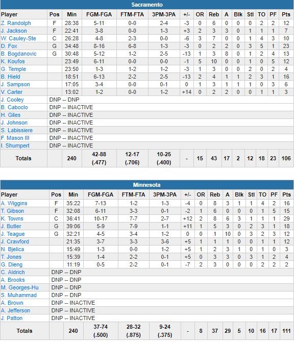 Menés une bonne partie du match, les Wolves sont d’abord repassés devant en début de 3ème quart avant de replonger puis de reprendre le contrôle alors que le dernier quart était déjà bien entamé. Towns et Teague ont chacun rentré un 3-points pour repasser devant 93-92 à 6’17 de la fin puis Jamal Crawford les a imités de loin et l’équipe n’a plus lâché son avantage ensuite. Buddy Hield (16 points) a rentré un 3-points en déséquilibre à 10.9 secondes de la fin mais Butler sur 2 lancers-francs et une interception sur remise en jeu, a sécurité la victoire des siens (28/32 aux lancers-francs, dont 16/18 dans le dernier quart).