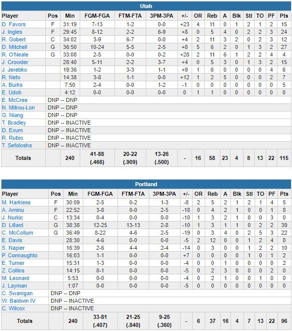 À noter : Rudy Gobert termine à 12 points (dont 2 sur 2 lancers-francs pour ramener les siens à 44-43 à la pause) et 11 rebonds, Derrick Favors 15 points et 11 rebonds. Le Jazz a dominé le 3ème quart 38-19. Jusuf Nurkic est sorti, touché au dos et à la hanche, dans le 3ème quart-temps.