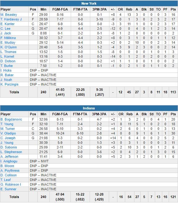 Vainqueurs des Celtics 97-91 vendredi, les Pacers ont dominé New York 121-113 dimanche avec un Victor Oladipo en mode All-Star (30 points à 10/24, 8 rebonds, 9 passes et 6 interceptions). Bojan Bogdanovic a lui artillé de loin avec 20 points et 4 tirs à 3-points alors que Thaddeus Young a signé un joli 18 points, 11 rebonds et 5 passes dans ce 6ème succès en 8 matchs pour Indiana.