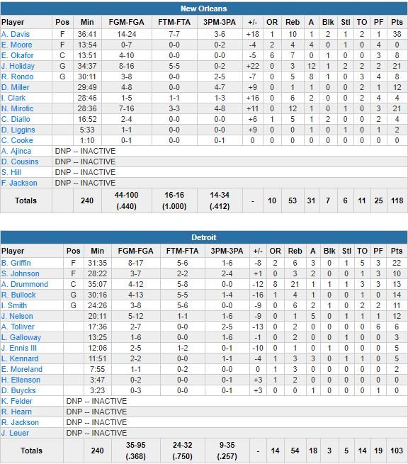 Pourtant surveillé de près par Andre Drummond (13 points à 4/12 et 21 rebonds) et Blake Griffin (22 points à 8/17, 6 rebonds et 3 passes) en défense, Davis s’est baladé en shootant de partout (3/6 à 3-points). Auteur de 10 points dans le 2ème quart, il a permis aux siens de mener 60-52 à la pause, avant que Nikola Mirotic (21 points et 12 rebonds) ne prenne le relais au retour des vestiaires. C’est la première fois depuis la blessure de DeMarcus Cousins que les Pelicans remportent 2 matchs d’affilée. Quant aux Pistons, ils restent désormais sur 3 défaites après avoir enchaîné 5 victoires (dont 4 avec Griffin).