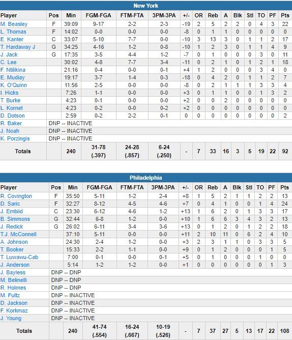 Les Knicks (16 passes décisives contre 27) ont égalisé pour la dernière fois du match sur un shoot d’Enes Kanter (17 points à 5/10 et 13 rebonds) à 3’57 de la fin du 3ème quart-temps. À partir de là, les Sixers, qui ont inscrit 13 des 19 derniers points de la période, ont pris le contrôle de la rencontre 86-79 avant de jouer le dernier quart. Un dernier quart qu’ils démarreront par un 8-0 et qui se terminera avec seulement 13 points pour New York.