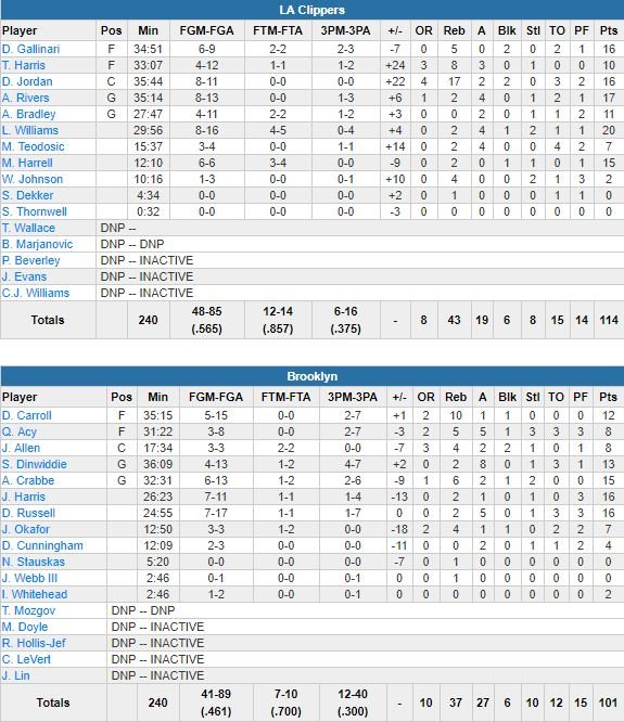 Victoire équilibrée des Clippers à Brooklyn cette nuit, 114-101. Lou Williams a terminé à 20 points, DeAndre Jordan à 16 points et 17 rebonds et 5 autres joueurs (dont Austin Rivers, 17 points, et Danilo Gallinari, 16 points) ont signé au moins 10 points dans ce match à 56.5% de réussite pour les joueurs de Doc Rivers.