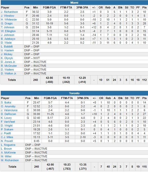 À 4’42 de la fin, Toronto s’est envolé 112-96 mais Dragic encore lui va boucler un 13-0 collectif sur 2 paniers consécutifs qui ont permis aux siens de recoller à 112-109 à 56 secondes de la fin. DeRozan a stoppé le run sur un 1/2 aux lancers. Après un temps-mort d’Erik Spoelstra, Dragic a manqué un 3-points, Pascal Siakam s’est emparé du rebond, Lowry a enchaîné sur un 1/2 aux lancers pour le +5 à 27 secondes. Wayne Ellington a ensuite ramené Miami à 114-112 sur un 3-points à 6 secondes mais Josh Richardson manquera ensuite la dernière chance du Heat derrière la ligne.