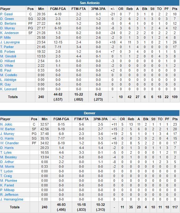 Pourtant plus adroits que leurs adversaires (53.7% à 49.5%) sur le match malgré un petit 6/22 à 3-points (contre 10/32), les Spurs ont été dominés dans de compartiments du jeu cruciaux, dont les points inscrits dans la peinture (avantage 64-46 Nuggets), les ballons perdus (avantage 12 à 19 Nuggets) ou encore les points inscrits sur contre-attaque (seulement 2, contre 19 pour Denver).