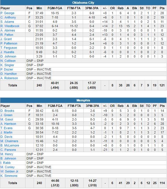 Malgré 28 points (10/15, 6 rebonds, 4 passes et 2 interceptions) de Paul George et un nouveau triple-double (le 17ème de sa saison) de Russell Westbrook (23 points à 6/14, 13 rebonds, 15 passes et 2 contres) en plus de 19 points (7/18) de Carmelo Anthony, le Thunder a bien failli gâché une avance de 22 points en seconde mi-temps avant de battre Memphis 121-114.