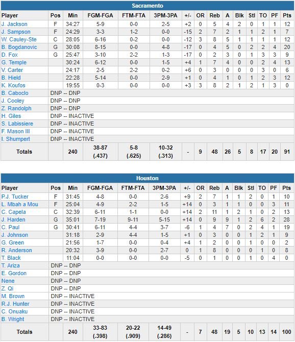 Houston a pris jusqu’à 17 points d’avance mais plusieurs runs adverses les ont empêché de totalement se détacher, même s’ils ont réussi à reprendre 11 points (94-83) suite à un 7-2 à une minute de la fin. Sauf que Sacramento a marqué les 5 points (dont un 3-points de Garrett Temple) suivants pour revenir à 6 points à 30 secondes de la fin. Joe Johnson, pour son premier match sous le maillot des Rockets, a répondu par 2 lancers-francs avant que Bogdan Bogdanovic (20 points) ne rentre un 3-points pour réduire l’écart à 96-91 à 25 secondes de la fin. Finalement, Houston a sécurisé la victoire avec 4 lancers-francs.