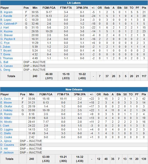 Kyle Kuzma et Brandon Ingram ont chacun terminé à 21 points, Julius Randle 20 points et Josh Hart 15 pour Los Angeles mais l’équipe a concédé son plus grande nombre de points de la saison dans ce match. Isaiah Thomas et Luke Walton ont tous les deux été éjectés en 1ère mi-temps, respectivement après une altercation avec Rajon Rondo (lui aussi exclu) enfin de 1er quart et après avoir protesté une faute technique sifflée à Kuzma dans le 2ème pour le coach.