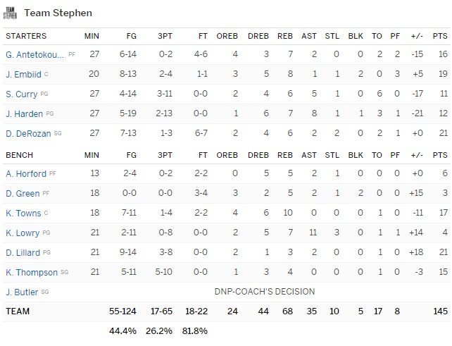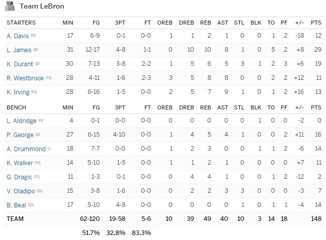 DeMar DeRozan et Damian Lillard finissent co-meilleurs marqueurs de la Team Stephen avec 21 points chacun alors que James a été épaulé par les 19 points de Paul George et 7 autres joueurs à au moins 10 points dont Kyrie Irving et ses 16 points, 7 rebonds et 9 passes (en plus de sa fin de match clutch). Kyle Lowry termine meilleur passeur du match avec 11 caviars, Joel Embiid signe 19 points et 8 rebonds, Karl-Anthony Towns 17 points et 10 rebonds. Parfaitement cadenassé dans les dernières secondes, Stephen Curry a terminé à 11 points à 4/14.