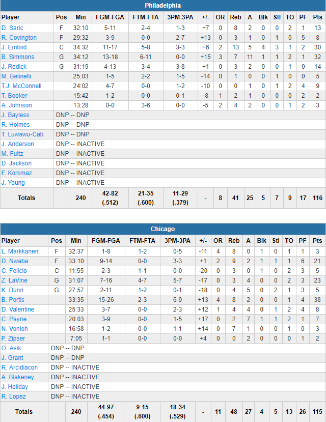 Ben Simmons est l’homme du match avec 32 points à 13/18, 7 rebonds et 11 passes, mais Joel Embiid n’est pas en reste avec 30 points à 11/17 dont 3/3 à 3-pts, 13 rebonds, 5 passes, 4 contres et 3 interceptions. Dario Saric ajoute 13 points et 8 rebonds pour des Sixers qui shootent à 51.2% et perdent seulement 9 ballons. En face les Bulls sont moins en réussite avec 45.4% mais compensent avec un superbe 18/34 à 3-pts. Ils ont été menés par un énorme Bobby Portis, auteur de 38 points à 15/26 dont 6/9 à 3-pts et 8 rebonds alors que Zach LaVine ajoute 23 points à 7/16 dont 5/7 à 3-pts et David Nwaba 21 points à 9/14 et 9 rebonds.