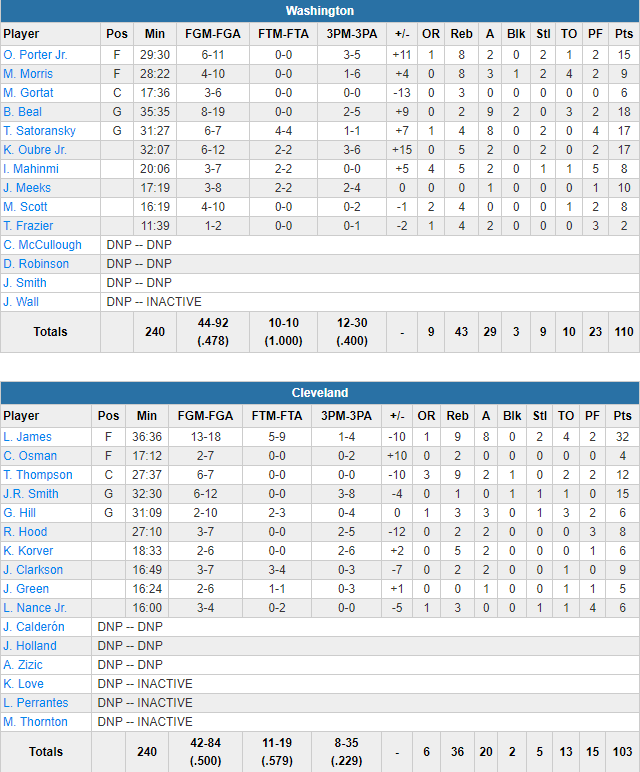 Washington s’est fait un peu peur en fin de rencontre en dilapidant une avance de 11 points lorsque LeBron James a scoré 14 points de suite pour ramener les siens à 3 points à 51 secondes de la fin, mais Bradley Beal a rentré un layup et LeBron a manqué ses deux lancers. Beal est un des 5 Wizards à marquer au moins 10 points avec 18 points à 8/19 et 9 passes. Tomas Satoransky et Kelly Oubre Jr. ajoutent 17 points chacun et Otto Porter Jr. en marque 15. Washington shoote moins bien que les Cavs avec 47.8% contre 50% mais ils rentrent 12 de leurs 30 tirs à 3-pts pour seulement 8/35 aux Cavs et ils ne perdent que 10 ballons et captent 9 rebonds offensifs. Côté Cleveland LeBron James a été un peu seul avec 32 points à 13/18, 9 rebonds et 8 passes. Jr Smith ajoute 15 points et Tristan Thompson 12 points à 6/7 et 9 rebonds.