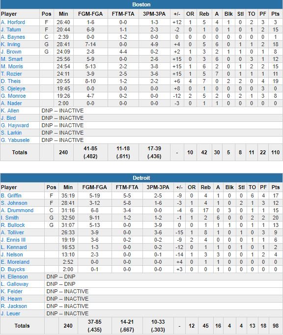 Boston a pris le contrôle de la rencontre sur un 38-21 infligé aux locaux dans le 2ème quart-temps. Ish Smith (20 points) avait pourtant rentré ses 8 premiers tirs et permis aux Pistons de mener 39-37 dans la période avant un 21-5 en faveur des Celtics, devant 61-49 à la mi-temps. Revenus à 4 points en fin de 3ème quart, les joueurs de Stan Van Gundy ont ensuite encaissé un 7-0 (5 d’Irving) qui a permis aux Celtics de prendre jusqu’à 20 points d’avance sans plus jamais regarder en arrière.