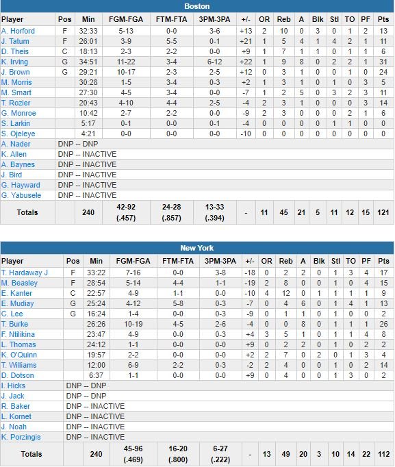 À noter : Boston a joué sans Aron Baynes, touché au coude. Shane Larkin était de retour après 9 matchs d’absence genou et n’a pas marqué en 5 minutes de jeu. Enes Kanter a capté 12 rebonds mais inscrit seulement 9 points, mettant fin à sa série de 10 double-doubles, la plus longue depuis David Lee (24) en 2008-09. Frank Ntilikina signe 8 points à 4/9, 5 rebonds et 1 passe en 23 minutes.