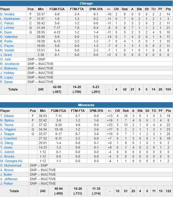 Les Wolves vont devoir s’y habituer sur les 4 à 6 prochaines semaines, Jimmy Butler n’est pas là. Contre Chicago hier, Jeff Teague (25 points), Andrew Wiggins (23 points), Karl-Anthony Towns (22 points et 13 rebonds) et Jamal Crawford (19 points) ont fait le taf pour s’imposer 122-104.