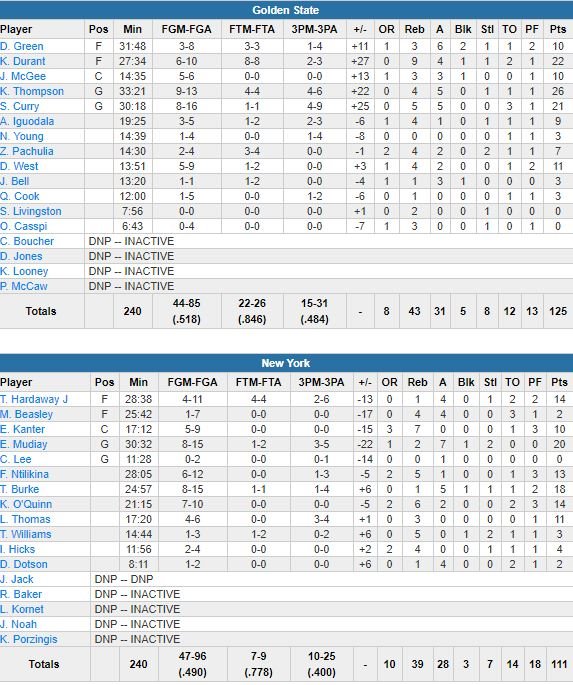 Après une correction infligée au Thunder samedi, les Warriors ont poursuivi sur leur lancée en faisant comme ils l’aiment tant, la différence dans le 3ème quart-temps (remporté 39-18) à New York cette nuit. Mené d’un point à la mi-temps (64-63), Golden State s’est imposé 125-111 avec 26 points (9/13, 4 rebonds et 5 passes) de Klay Thompson, 21 (8/16, 5 rebonds et 5 passes) de Stephen Curry dont 14 dans le 3ème quart et 22 points (6/10, 9 rebonds et 4 passes) de Kevin Durant.