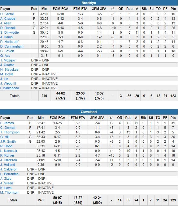 Quelques instants plutôt, Jordan Clarkson avait fait passer les siens devant sur un 3-points après 2 lancers-francs de Jarrett Allen à 1’18, mais Allen Crabbe lui avait répondu en rentrant un runner pour le +1 de Brooklyn, 121-120. Titulaire aux côtés de Spencer Dinwiddie, D’Angelo Russell termine meilleur marqueur des Nets (dominés 55-36 au rebond) avec 25 points à 9/18, 5 rebonds et 6 passes.