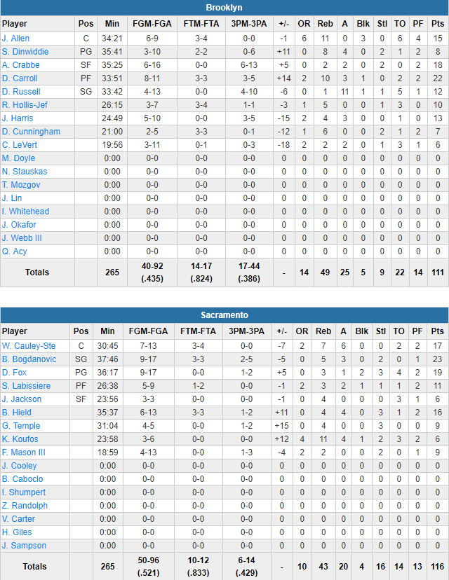 Sacramento a pu compter sur un excellent Bogdan Bogdanovic, clutch en prolongation avec notamment le panier pour passer définitivement devant. Il termine avec 23 points à 9/17, très bien aidé par De’Aaron Fox, auteur lui de 19 points à 9/17 alors que Willie Cauley-Stein ajoute 17 points à 7/13, 7 rebonds et 6 passes et Buddy Hield 16 points à 6/13. Les Kings shootent à 52.1% contre seulement 43.5% à Brooklyn mais ces derniers compensent en rentrant 17 tirs à 3-pts contre seulement 6 aux Californiens. Les Nets ont eux été menés par les 22 points et 10 rebonds de DeMarre Carroll, les 18 points d’Allen Crabbe, les 15 points, 11 rebonds de Jarrett Allen et enfin les 12 points à 4/13 et 11 passes de D’Angelo Russell.