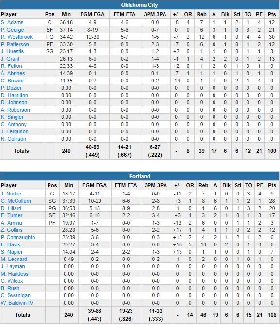 À noter : Corey Brewer a joué 11 minutes pour son premier match avec OKC. Le Thunder (17 passes décisives seulement sur le match), dominé 46-39 au rebond, n’a rentré que 6 de ses 27 tentatives à 3-points (contre 11/33 pour les Blazers).