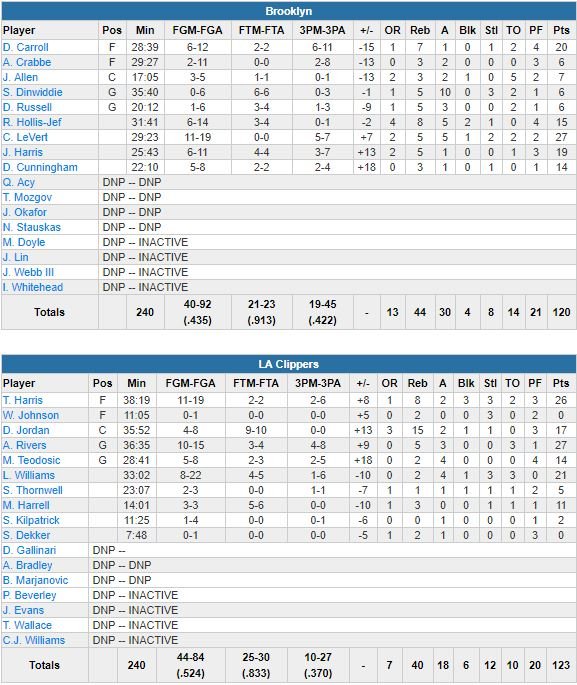 Tobias Harris a lui signé 26 points dans cette 9ème défaite d’affilée infligée à Brooklyn. Dominateurs tout le match après avoir lancé leur partie sur un 10-0, les Clippers n’ont pas réussi à tuer le match avant les derniers instants. L’équipe a pourtant pris jusqu’à 15 points d’avance mais les Nets (27 points à 5/7 à 3-points pour Caris LeVert, 20 points de DeMarre Carroll) ont réussi à revenir à 97-96 à 9’41 grâce à une série de 3-points. Ils ont même mené de 8 points (118-110) avant le retour des locaux, dominés 67-58 en seconde mi-temps.