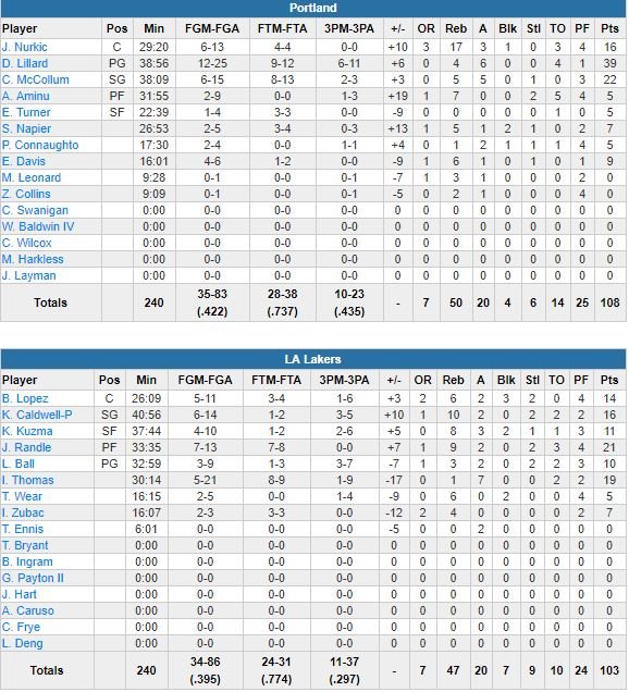 Devant 80-73 à la fin du 3ème quart-temps suite à un 25-15 infligé aux Blazers dans la période après avoir été menés 58-55 à la pause, et de 11 points à 5’26 du buzzer, les Lakers ont coulé dans un 4ème quart perdu 35-23 et dominé par un Damian Lillard en feu (4 tirs à 3-pts de suite et 19 points de ses 39 points dans la période). Mais battus (108-103) pour la première fois en 6 rencontres, ils peuvent tout de même s’en mordre les doigts.