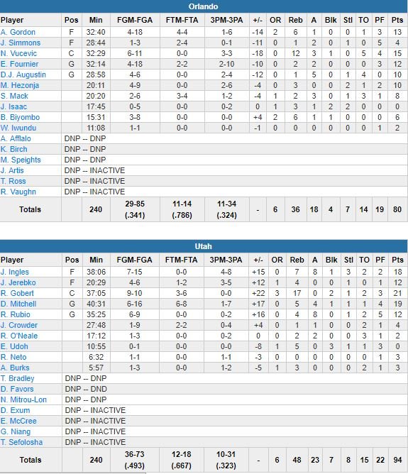 À noter : Derrick Favors a manqué le match pour des douleurs au cou, Jonas Jerebko a pris sa place et inscrit 12 points, tout comme Ricky Rubio. Le banc du Jazz (15V-4D depuis le retour de Gobert) a dominé celui du Magic 26-12.