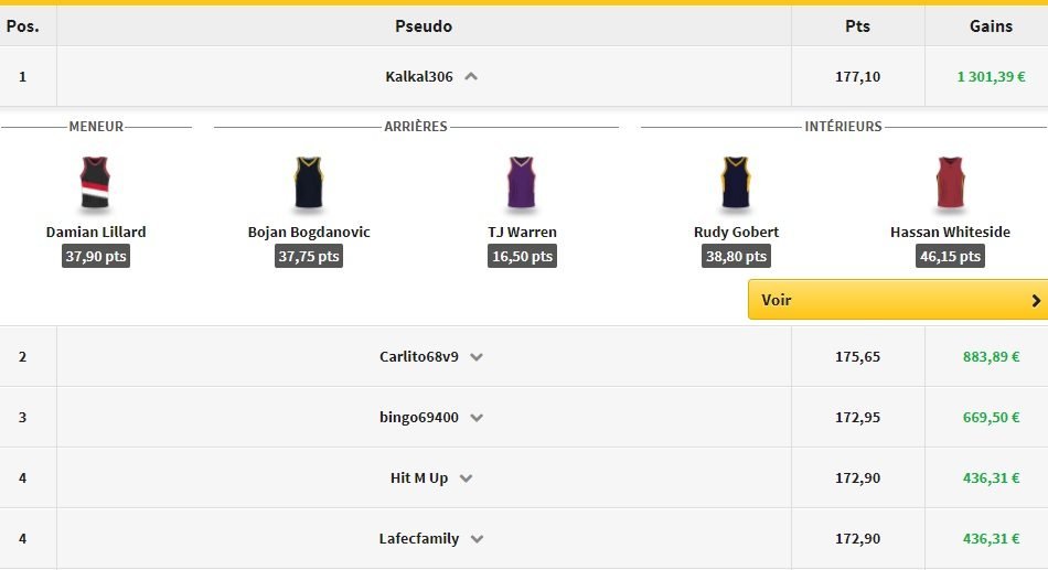 C’est Kalkal306 qui l’emporte avec un 5 Lillard, Bogdanovic, Warren, Gobert et Whiteside qui totalise 177.10 pts et rapporte une somme sans doute record sur la saison de 1 301.39€.