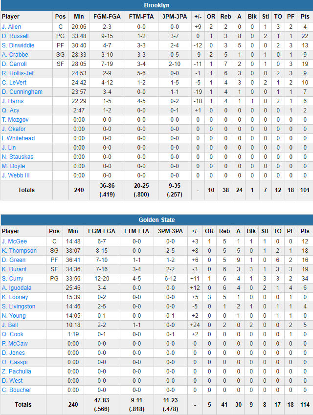 Ils ont été menés par Stephen Curry, bien remis de sa petite blessure à la cheville puisqu’il signe 34 points à 12/20 dont 6/12 derrière l’arc en plus de 6 rebonds, 4 passes et 3 interceptions. Il a été aidé par les 19 points de Kevin Durant, les 18 de Klay Thompson et les 16 de Draymond Green (9 passes) alors que JaVale McGee ajoute 12 points à 6/7. Les champions shootent à 56.6% dont un joli 11/23 à 3-pts, bien mieux que les Nets, qu’ils ont limité à 42.4% dont 9/34 à 3-pts. Ces derniers ont pu compter toutefois sur 22 points à 9/15 et 8 passes de D’Angelo Russell et 19 points à 7/19 et 7 rebonds de DeMarre Carroll. Ces derniers s’inclinent pour la 4ème fois de suite et restent plus que jamais en course pour le pire bilan de la ligue, même s’il y a de la concurrence.